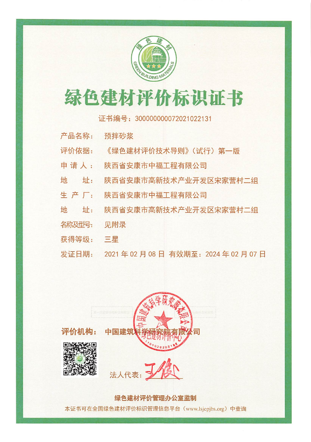 黨的十八大以來,保護環(huán)境,使用綠色建材、實施綠色建筑,已成為建筑行業(yè)和全社會的廣泛共識。根據(jù)國家相關(guān)部委發(fā)布的《關(guān)于推動綠色建材產(chǎn)品標準、認證、標識工作的指導意見》,結(jié)合上級主管部門和建筑行業(yè)的監(jiān)管要求,中福公司立足實際,積極響應政府發(fā)展綠色產(chǎn)品的號召,于2020年初開展了中福公司綠色建材評價標識工作。經(jīng)過多年的精心準備,于2021年2月初喜獲中國建筑科學研究院有限公司頒發(fā)的“陜西省安康市中福工程有限公司預拌混凝土、預拌砂漿綠色建材評價標識認證證書”(等級為三星)。